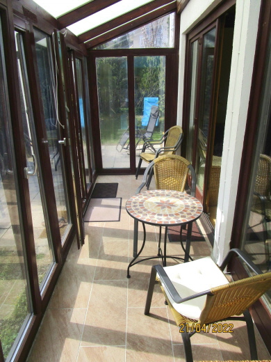 Wintergarten vor Wohnzimmer, schöne Gartenterrasse mit Grillmöglichkeit,  Tisch + Stühle, Relax-Liegen,